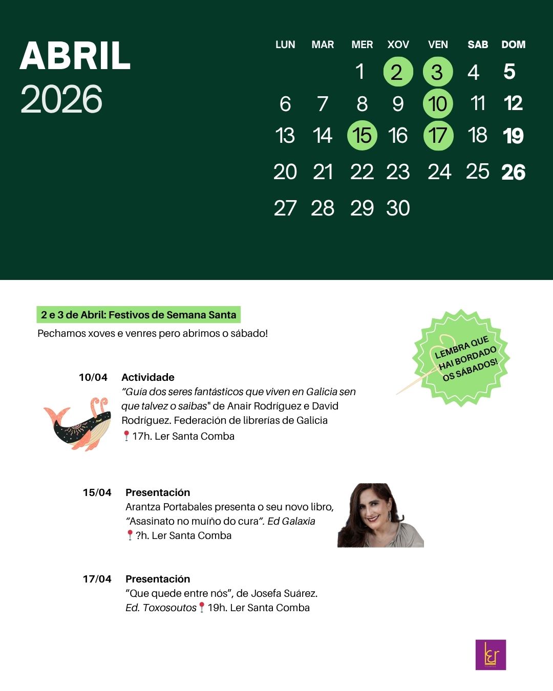Publicado en Ana Benito19/08/2025Trustindex verifica que la fuente original de la reseña sea Google. Ha sido un milagro encontrar esta librería . He comprado varios libros online,que están agotadisimos ,han sido super amables y pacientes ,me han facilitado todo para el pago y envío hasta Madrid . El pedido ha llegado envuelto y empaquetado con el máximo cuidado ,incluido regalitos . Todo el tiempo estaban atentos con la entrega . Que alegría y felicidad que te atiendan así !!!Publicado en OMP05/08/2025Trustindex verifica que la fuente original de la reseña sea Google. Magnífica estantería de libros y novelas. Los empleados sonuy amables y eficientes, hacia tiempo que no visitaba una librería tan buena. En cuanto notan que no hablas Gallego te atienden en Castellano. Recomiendo visitar la librería y echar un vistazo, seguro encuentras algún buen libro. Gran variedad de marcapáginas.Publicado en A Pl09/06/2025Trustindex verifica que la fuente original de la reseña sea Google. Todo cuanto necesita un lector o estudiante,lo encontrará aqui.Isabel un encanto y su equipo de 10.Publicado en Hernan Eduardo Alvarez Haedo08/06/2025Trustindex verifica que la fuente original de la reseña sea Google. La mejor libreria de la zona. Atendida de manera calida y amable. Realizan eventos de manera continua.Publicado en Laura Franco Lado13/05/2025Trustindex verifica que la fuente original de la reseña sea Google. Librería moi completa. Teñen presentacións de maneira habitual. Trato inmellorable!!Publicado en Lizeth Talia jamanca gonzales05/04/2025Trustindex verifica que la fuente original de la reseña sea Google. Atención excelente