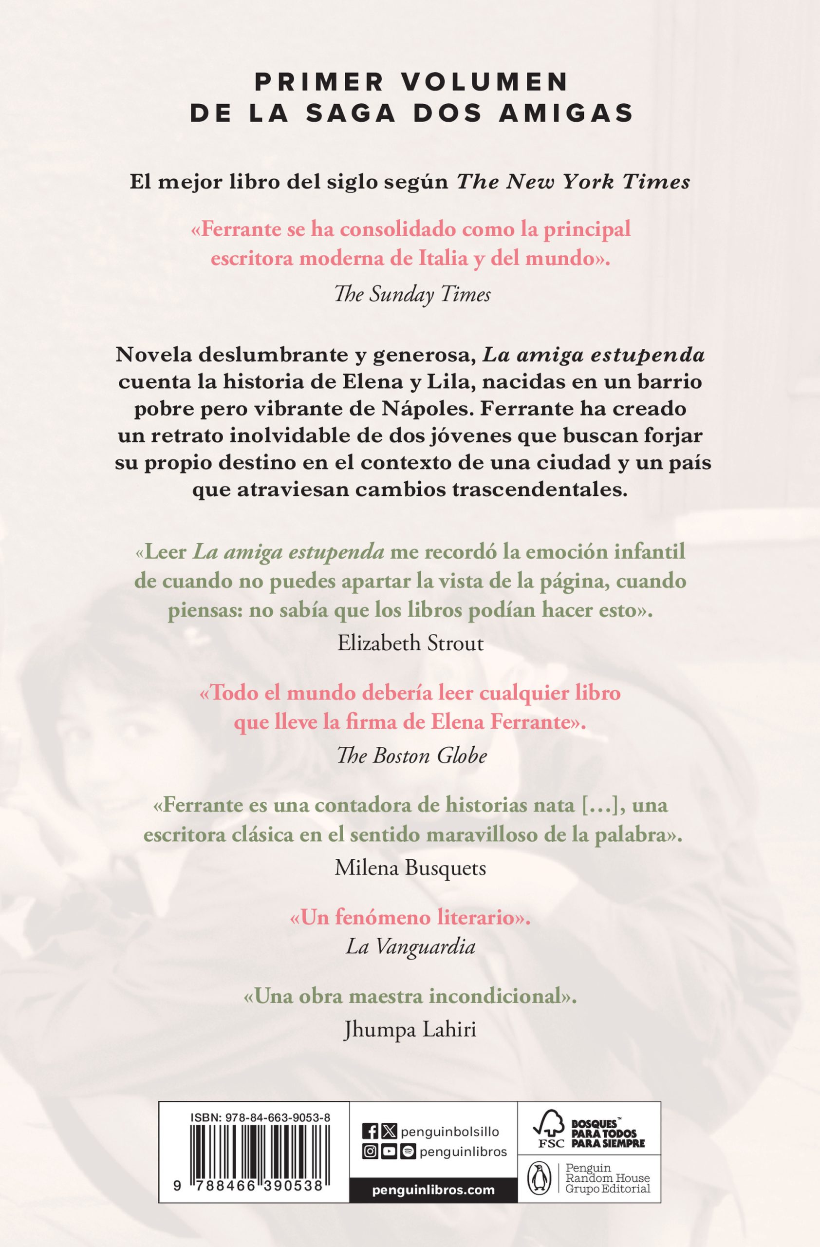 Nicola Lagioia UNA SAGA MEMORABLE Con La amiga estupenda, Elena Ferrante inaugura una saga deslumbrante que tiene como telón de fondo la ciudad de Nápoles a mediados del siglo pasado y como protagonistas a Lenù y Lila, dos jóvenes mujeres que están aprendiendo a gobernar su vida en un entorno donde la astucia, antes que la inteligencia, es el ingrediente de todas las salsas. La relación tempestuosa entre Lila y Lenù nos muestra la realidad de un barrio habitado por gente humilde que acata sin rechistar la ley del más fuerte. Los que llenan estas páginas con sus risas, sus gestos y sus palabras son hombres y mujeres de carne y hueso, que nos sacuden por la fuerza y la urgencia de sus emociones. La primera novela italiana en décadas que, según The Guardian, se merece el Premio Nobel ha conquistado a más de veinte millones de lectores y ha sido llevada a la televisión en una gran serie. Además, recientemente The New York Times preguntó a 503 novelistas, como Stephen King, James Patterson, Karl Ove Knausgaard o Bonnie Garmus cuál era, a su juicio, el mejor libro del siglo XXI. La amiga estupenda quedó en primer lugar.La crítica ha dicho: «Ferrante es una contadora de historias nata, tan extraordinaria y adictiva como mi también adorado John Irving, una escritora clásica en el sentido maravilloso de la palabra».