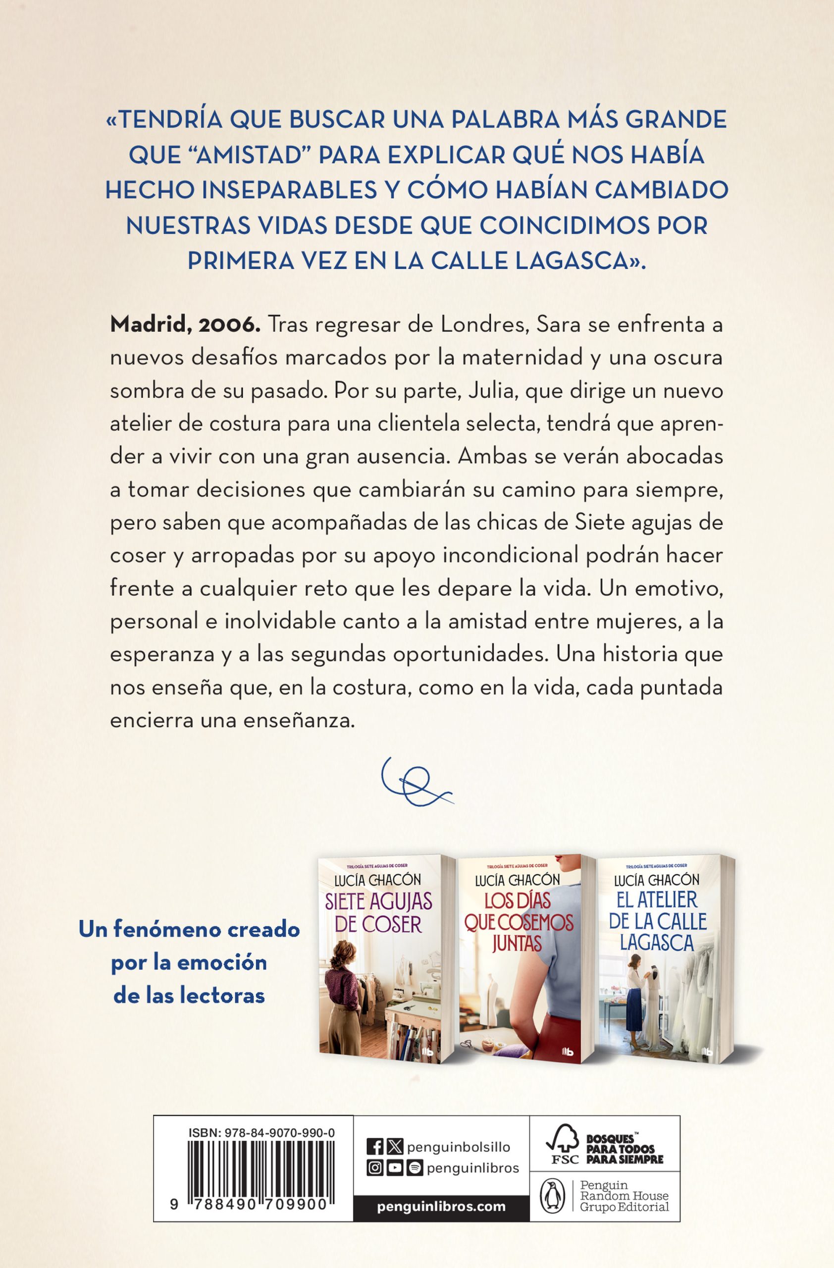 Vuelve Lucía Chacón (@menudonumerito) con el emotivo cierre de la trilogía Siete agujas de coser. «Una historia intimista, dulce y honesta donde la amistad y la esperanza crecen a ritmo de puntadas». Ana Lena Rivera, autora de Las herederas de la Singer Madrid, 2006. Tras regresar de Londres, Sara se enfrenta a nuevos desafíos marcados por la maternidad y una oscura sombra de su pasado. Por su parte, Julia, que dirige un nuevo atelier de costura para una clientela selecta, tendrá que aprender a vivir con una gran ausencia. Ambas se verán abocadas a tomar decisiones que cambiarán su camino para siempre, pero saben que acompañadas de las chicas de Siete agujas de coser y arropadas por su apoyo incondicional podrán hacer frente a cualquier reto que les depare la vida. A través de la inquebrantable unión de las protagonistas de la trilogía Siete agujas de coser, Lucía Chacón nos traslada a los albores del siglo XXI y dibuja su emotivo, personal e inolvidable canto a la amistad entre mujeres, a la esperanza y a las segundas oportunidades. Una historia que nos enseña que en la costura, como en la vida, cada puntada encierra una enseñanza. «Tendría que buscar una palabra más grande que «amistad» para explicar qué nos había hecho inseparables y cómo habían cambiado nuestras vidas desde que coincidimos por primera vez en la calle Lagasca».