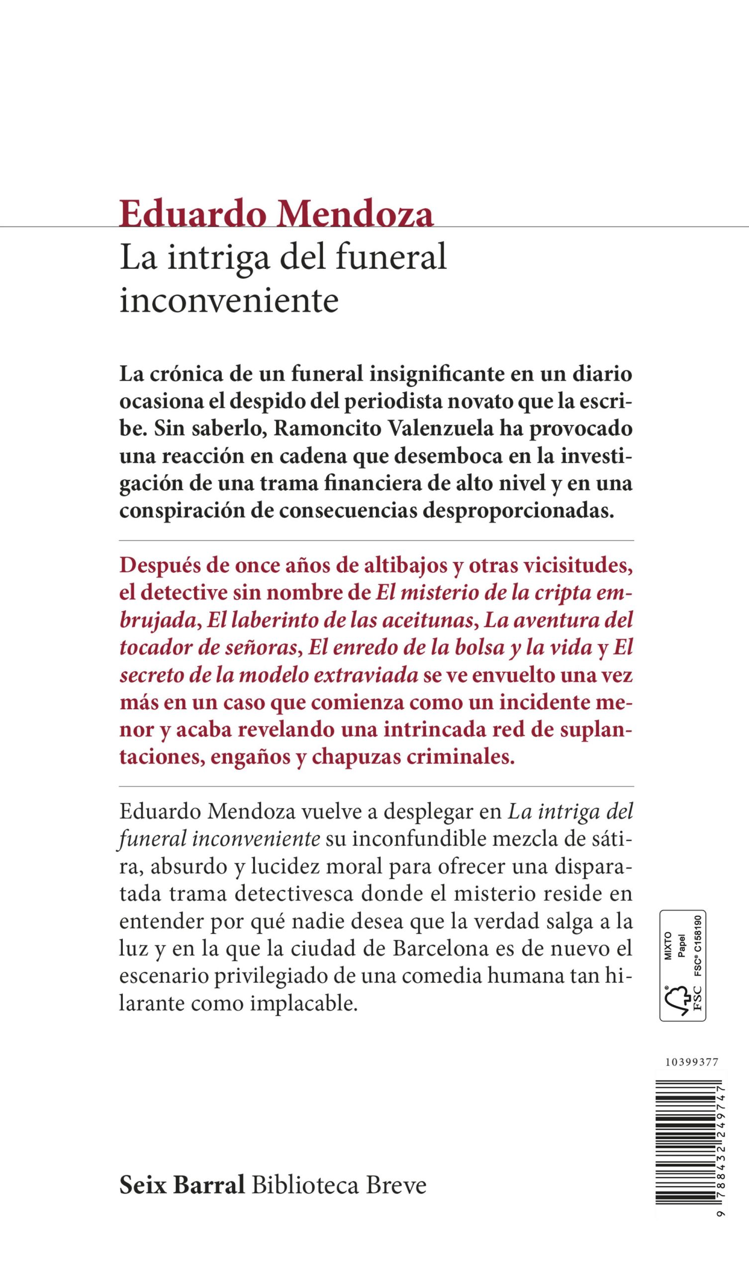 Eduardo Mendoza vuelve a desplegar en La intriga del funeral inconveniente su inconfundible mezcla de sátira, absurdo y lucidez moral para ofrecer una disparatada trama detectivesca donde el misterio reside en entender por qué nadie desea que la verdad salga a la luz y en la que la ciudad de Barcelona es de nuevo el escenario privilegiado de una comedia humana tan hilarante como implacable.