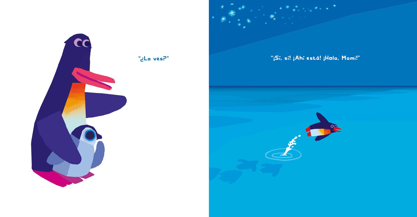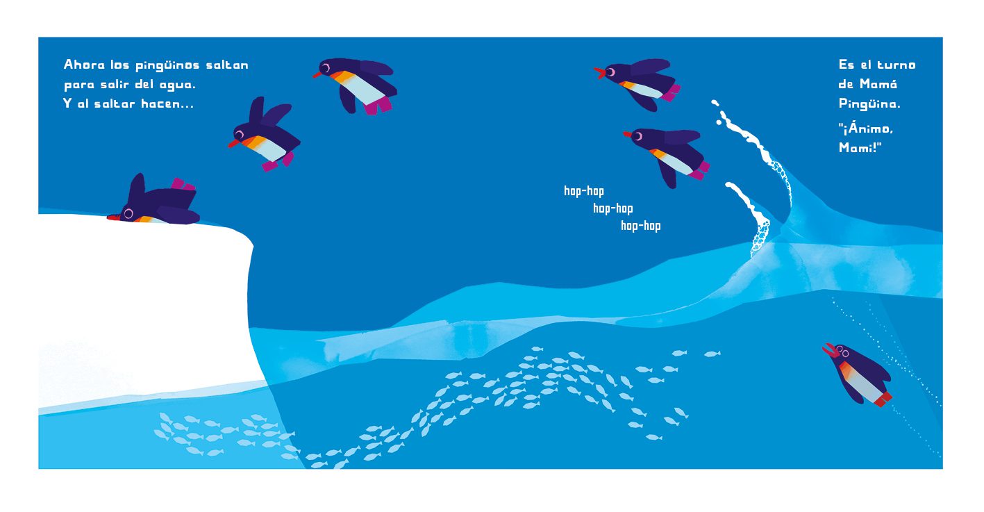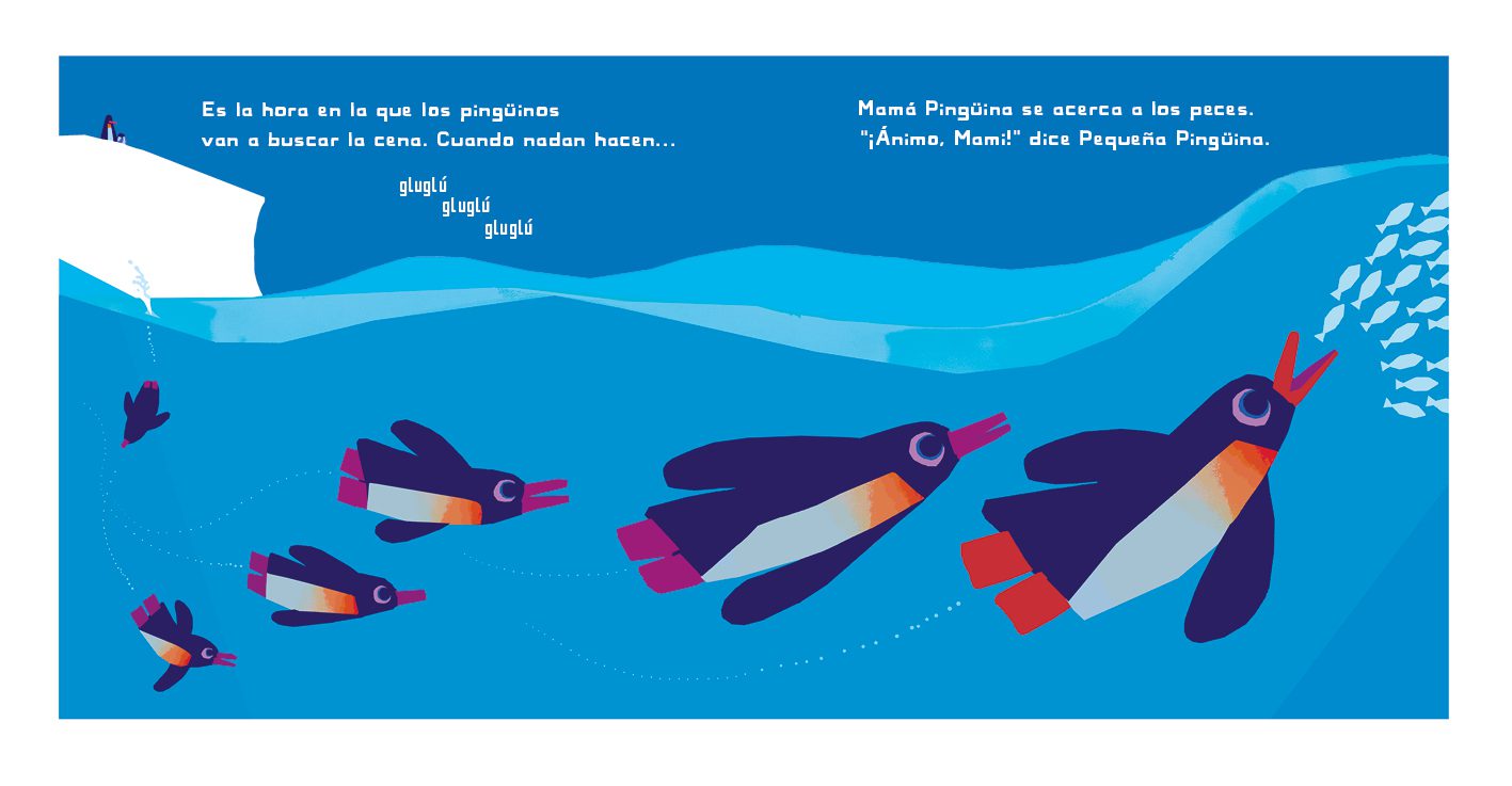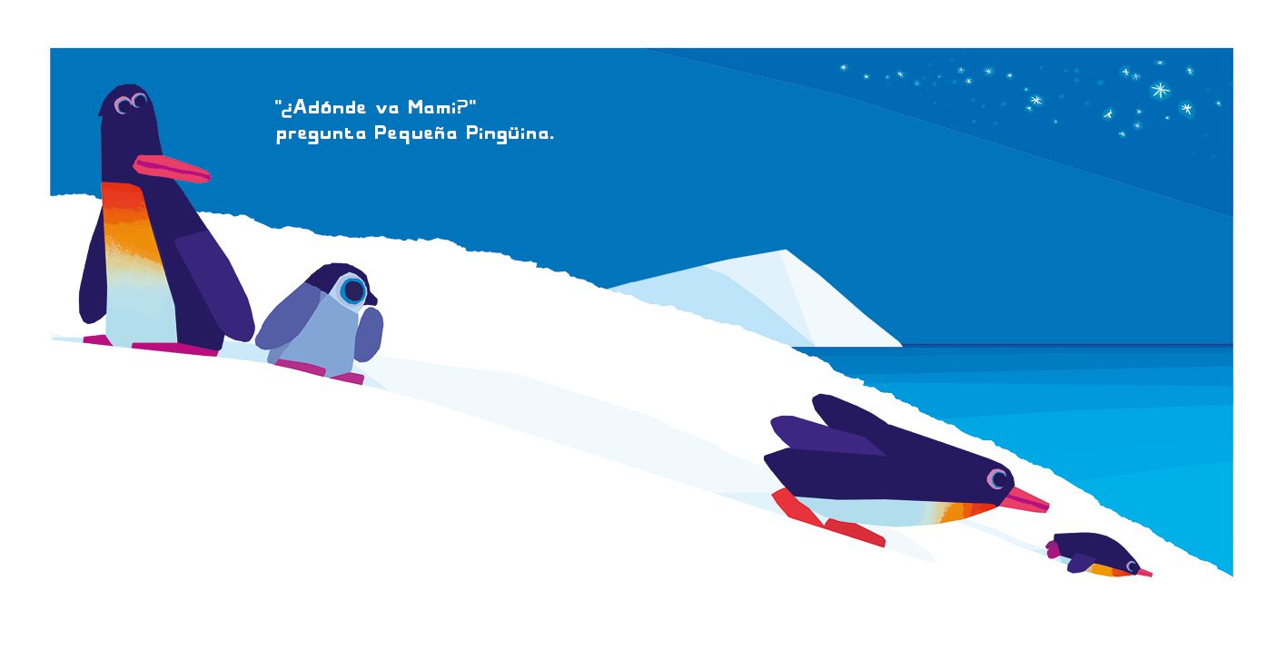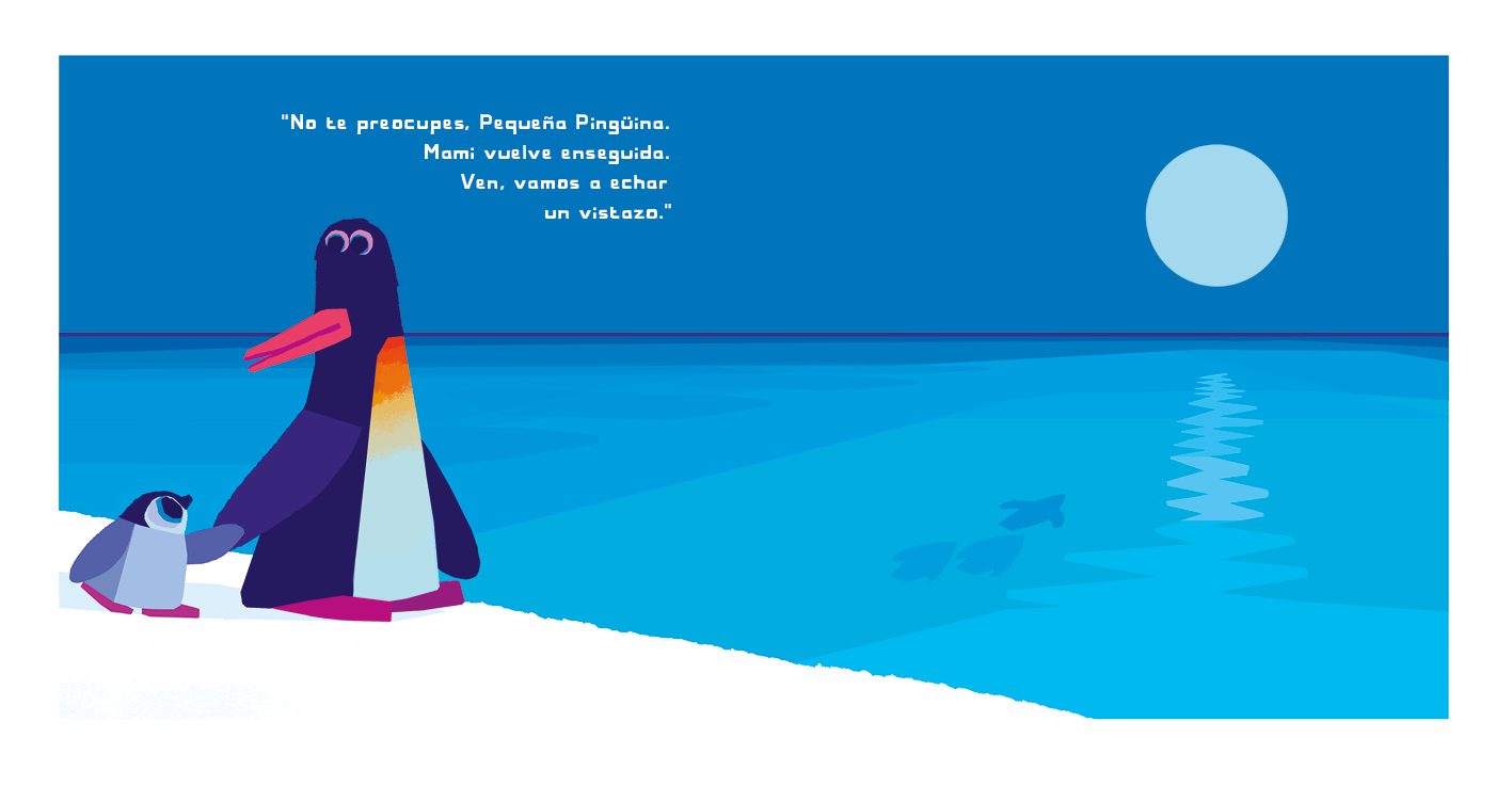 ¡junto a unas feroces focas dormidas! Pequeña Pingüina la mira desde lejos y pregunta: «¿Mami volverá pronto?». Seguro que sí, dice Papá Pingüino.