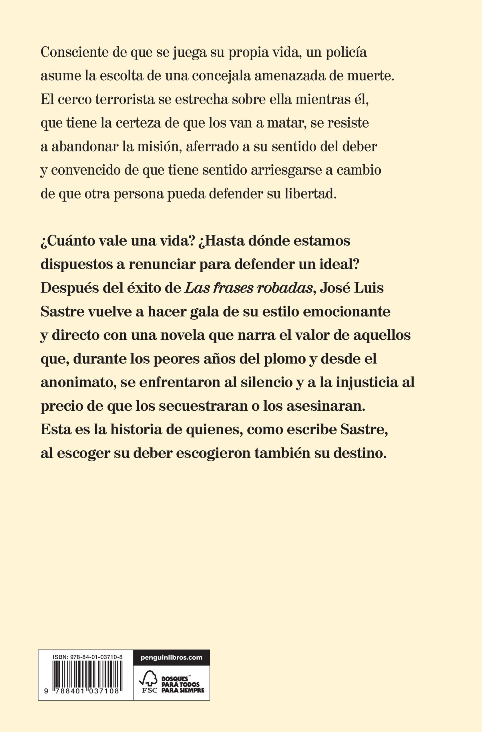 Hay gente que, al escoger su deber, escoge también su destino. Después del éxito de Las frases robadas, José Luis Sastre vuelve con un relato emocionante sobre quienes asumen su deber al precio de pagarlo con sus vidas. Consciente de que se juega su propia vida, un policía asume la escolta de una concejala amenazada de muerte. El cerco terrorista se estrecha sobre ella mientras él, que tiene la certeza de que los van a matar, se resiste a abandonar la misión, aferrado a su sentido del deber y convencido de que tiene sentido arriesgarse a cambio de que otra persona pueda defender su libertad. ¿Cuánto vale una vida? ¿Hasta dónde estamos dispuestos a renunciar para defender un ideal? Después del éxito de Las frases robadas, José Luis Sastre vuelve a hacer gala de su estilo emocionante y directo con una novela que narra el valor de aquellos que, durante los peores años del plomo y desde el anonimato, se enfrentaron al silencio y a la injusticia al precio de que los secuestraran o los asesinaran. Esta es la historia de quienes, como escribe Sastre, al escoger su deber escogieron también su destino.