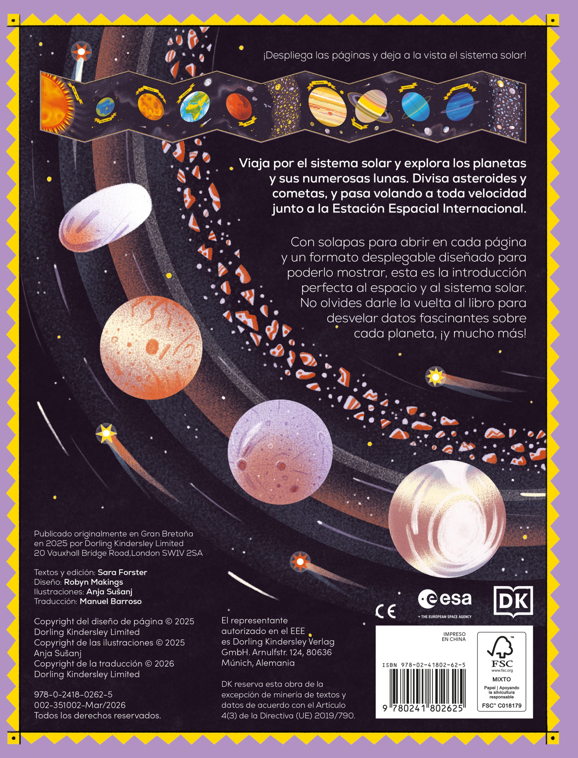 Emprende un increíble viaje espacial que te llevará por nuestro Sistema Solar Embárcate en un emocionante viaje por el espacio con este libro desplegable lleno de sorpresas, creado en colaboración con la Agencia Espacial Europea (ESA). Una increíble aventura cósmica que te permitirá viajar a través del Sistema Solar, descubrir sus planetas y lunas, y observar asteroides y cometas. El libro perfecto para pequeños exploradores del espacio: – Cada página incluye solapas y elementos desplegables que invitan a descubrir y aprender jugando. – Un recorrido lleno de datos fascinantes, con contenido desarrollado junto a expertos de la ESA. – Un regalo ideal para los niños y las niñas que aman el espacio, con páginas resistentes y un cierre con cinta. Cuando termines de explorar las páginas desplegables ¡da la vuelta al libro y descubre aún más curiosidades sobre nuestro Sistema Solar! Atemporal, educativo y divertido, Un viaje por el Sistema Solar es un libro imprescindible para las mentes jóvenes más curiosas del universo.