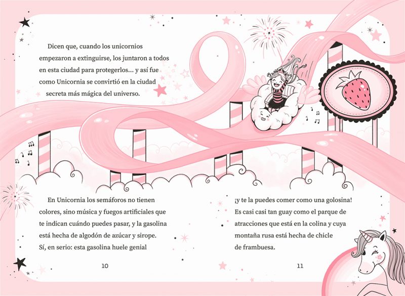 UNICORNIA, DONDE LA MAGIA TE HARÁ VOLAR Esto es Unicornia, la ciudad de los unicornios. Claudia se acaba de mudar aquí y no hay duda: ¡es el lugar más mágico del universo! *En el cielo verás pájaros… ¡y unicornios volando!* *La comida puede cambiar de sabor… ¡y de color!* *No hay clase de matemáticas… ¡aquí hacemos pociones* Unicornia es genial, pero no es perfecta: en el Colegio de Magia Superior también hay exámenes. ¡Y justo mañana Claudia tiene la prueba de vuelo de unicornio! ¿Podrá aprender a montar en tiempo récord? ___________________________ Escuela, amistad y unicornios en una serie de primeras lecturas llena de magia: -Preciosas y divertidas ilustraciones que acompañan la historia en cada página. -Texto sencillo y entretenido, fácil de leer y entender. -Con purpurina (¡sí, brilli-brilli!) en la cubierta. -Para jóvenes lectores a quienes gusten los unicornios o quieran flotar entre nubes de azúcar. -De la autora bestseller Ana Punset, que también sueña con volar con unicornios. ¡Bienvenidos a Unicornia!