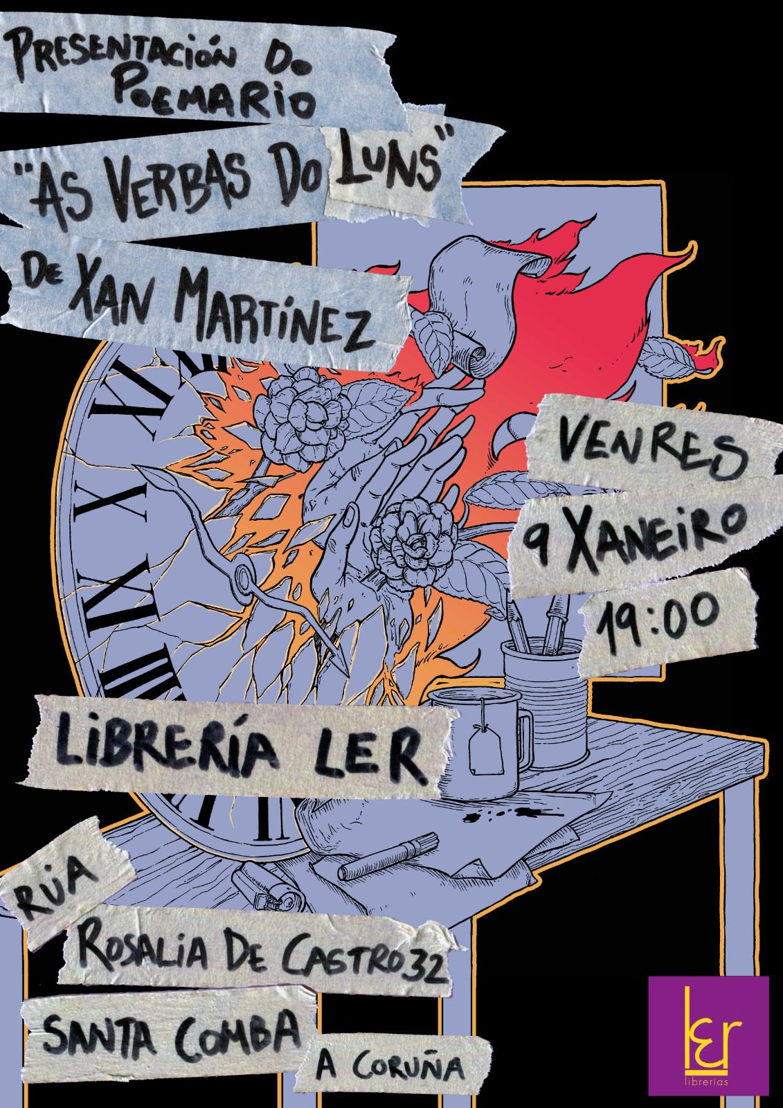 Ler Librerías Santa CombaLibro de poemas de Xan Martínez, elaborado de maneira artesanal seguindo unha técnica xaponesa. O autor estará acompañado por algunhas e algúns alumnos da Escola Sen Cancelas Teatro, así como polo ilustrador da obra